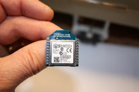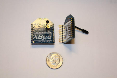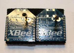 | Two Xbee radios used for remote control. They operate at 2.4 ghz and have a rang of about 100' inside. | Xbee radio mounted on shield. This one is used to transmit joystick commands. |