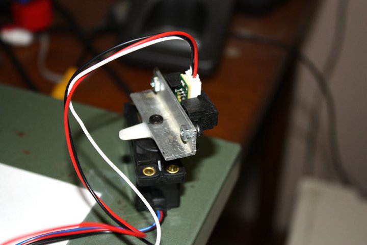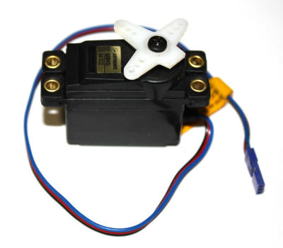 | To detect a wider ranger, the top IR sensor is mounted to an RC plane servo and it sweeps back and forth. My servo was an old one I bought years ago but rarely used. It is relatively big but it makes no difference on my robot. The sweeping is controlled by software. It is super easy with a microcontroller to tell it exactly how many degrees to sweep, how wide to sweep and at what resolution. It all can be changed in seconds. Plus the sample code to do this is included free with the Arduino software environment. | ![]() |