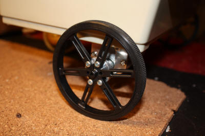 | 80 RPM 12 volt motors from Pololu Robotics. | Wheels mounted to hubs mounted to motors. |