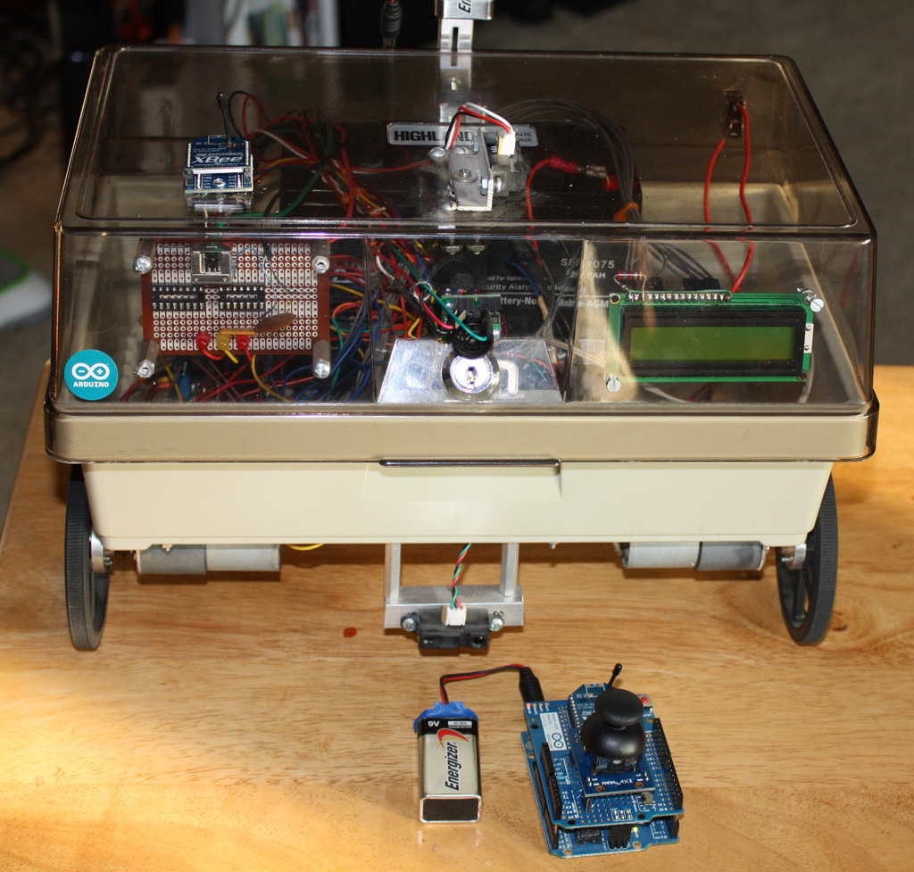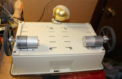 | Sharp IRR mounted on servo which sweeps 110 degrees. | 80 RPM 12 volt motors from Pololu Robotics. |