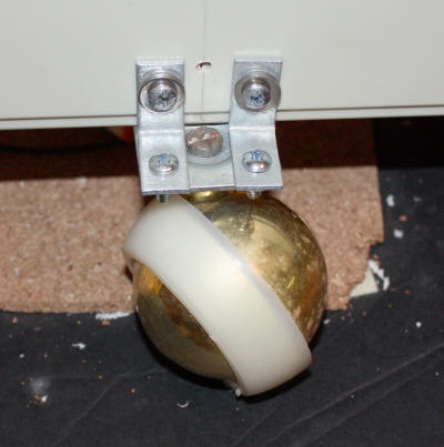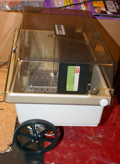 | Front view show battery in place. | Underside with furniture caster for third wheel. |