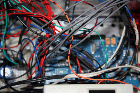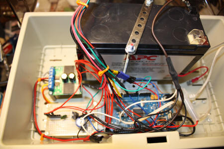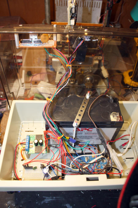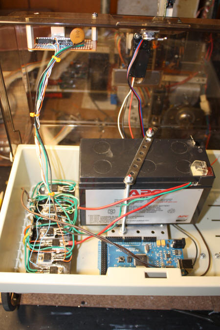 | Bottom view show the sensor array, motors and idler wheel. | Rats nest of wires, yeah! |