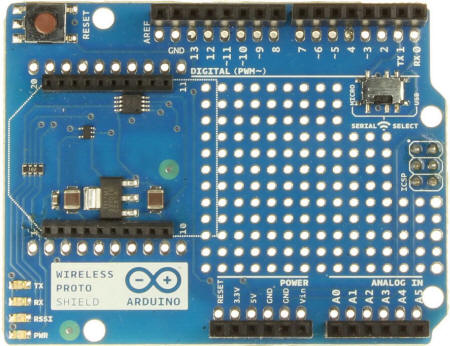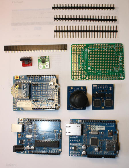 | Arduino Uno, a secondary microcontroller for remote control. It will drive one of the Xbee radios. | Wireless shield which Xbee radio will sit on which will mount to Uno. |
