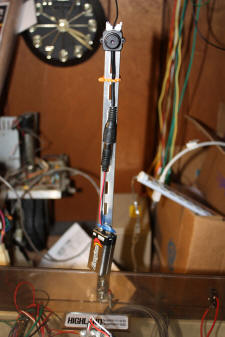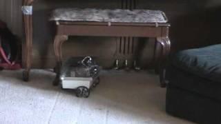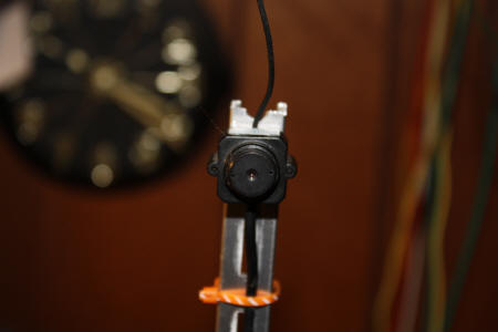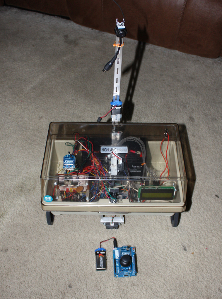 Another latest addition is a spy cam. I have an old 2.4 ghz wireless color video camera mounted at the top of a short mast. I am hoping to use the video cam to drive the robot around the house. Not sure of the range of the camera. It is old and low tech but we'll see.