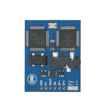 | Various shields and circuits used with Arduinos. The green board is a prototype I got from Radio Shack for $10 and includes sockets, headers, switch, etc. | The Emic voice synthesizer from Parallax. You send it a text word and it speaks it. Very easy to use and sounds pretty good. |