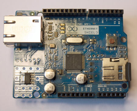 | Xbee radio mounted up on the "hood". | The Ethernet shield allows for any Arduino to talk over the internet. |